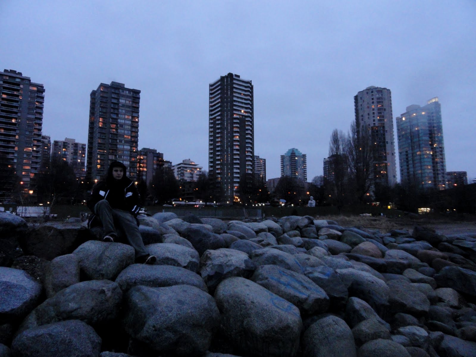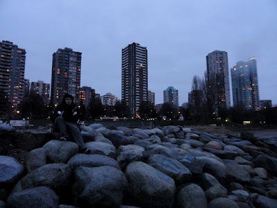 As the date of my departure from Whistler approached, I felt a wierd mixture of stoke, anxiousness, excitement and uncertainty about the looming adventure. I had a rockin last few days in Vancouver - skating around going to gigs and parties and crashing on Dani and Jarrods 31st floor couch with a million dollar view. On my last frigid morning in the dark, lugging my possessions in my vagabond surfboard bag - I saw a skunk cross the road at the pedestrian crossing and wander down to the waters edge - I figured this was a good sign so I was happy.
